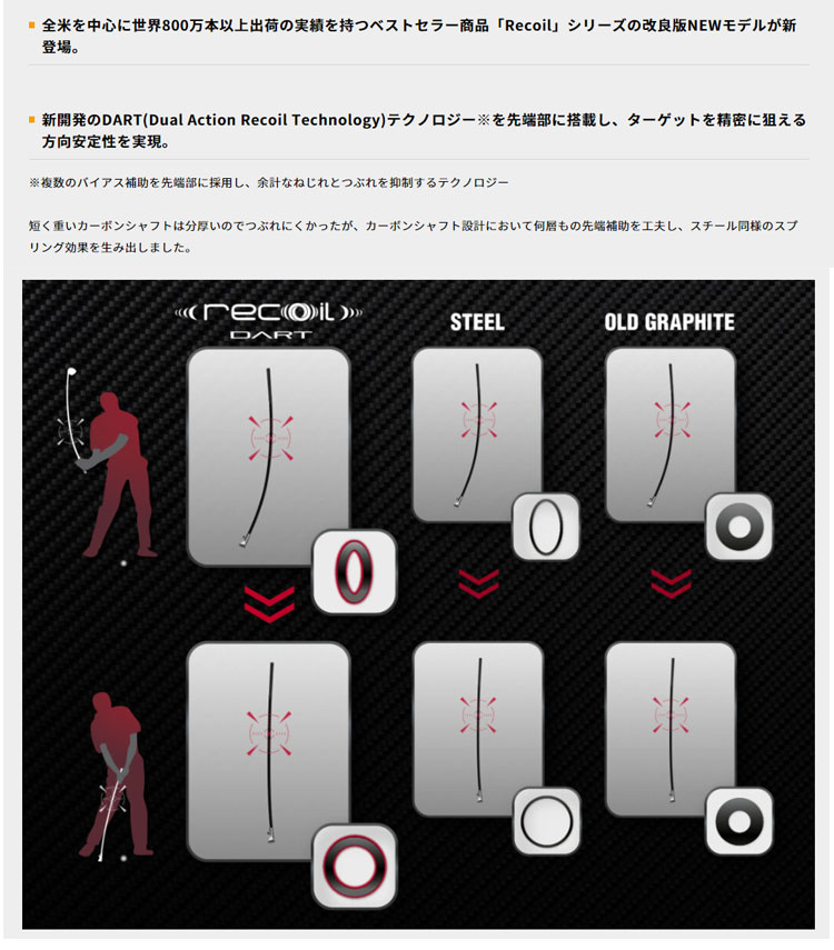 短く重いカーボンシャフトは分厚いのでつぶれにくかったが、カーボンシャフト設計において何層もの先端補助を工夫し、スチール同様のスプリング効果を生み出しました。