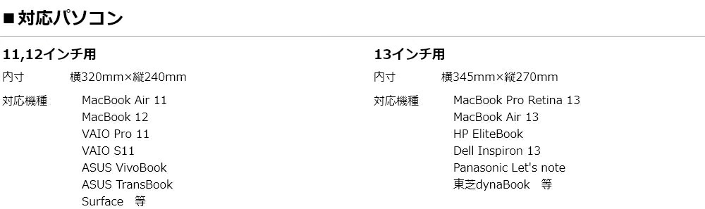 ■11,12インチ用 内寸 横 320mm×縦 240mm(厚みにより中に入るサイズは変わります。) 対応機種例:MacBook Air 11 MacBook 12 Chromebook IdeaPad Slim Lenovo LAVIE Let's note VAIO Pro 11 VAIO S11 ASUS VivoBook ASUS TransBook Surface 等