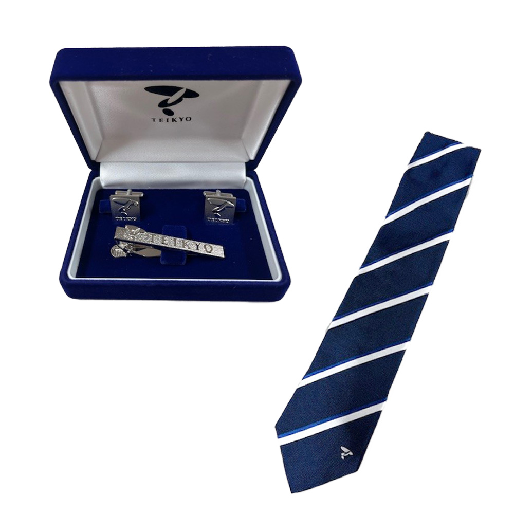 TEIKYOのロゴを使用したカフス・タイピン・ネクタイ ネイビーのセットです。