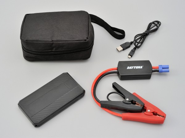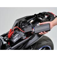 手の平サイズのバッテリーブースター。セットで持ち運んでも車体収納スペースに収まるサイズ。
