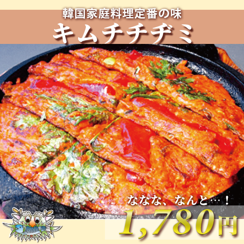 フライパン一つで本格韓国料理! テジョンデ自家製キムチを使用しチヂミの生地と一緒に焼き上げました。キムチの酸味とゴマ油の香ばしさが引き立つ一品です。