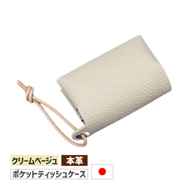 ポケットティッシュケース カバー ティッシュポーチ クリームベージュ/金具シルバー 本革 日本製 手作り