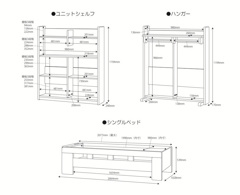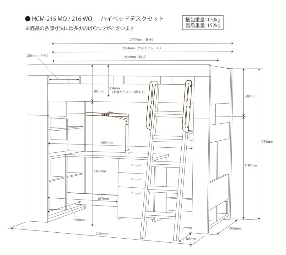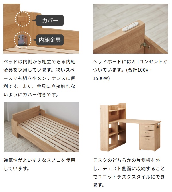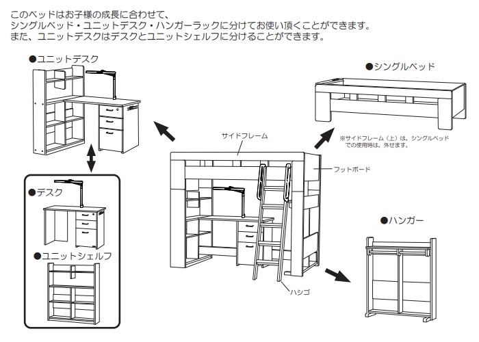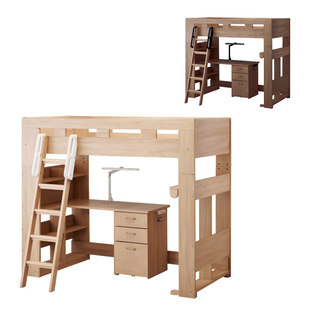 | 特徴 | 構成品:シングルベッド・デスク・ハンガーラック・シェルフ・ハシゴ・スノコ 〇ヘッドボードに2口コンセント付き 〇デスクにLEDモードコントロールアームライトSB-611(MO)・612(WO)付き |