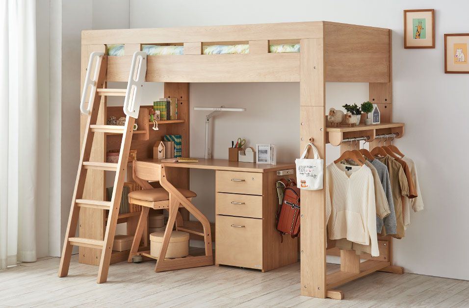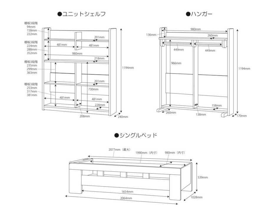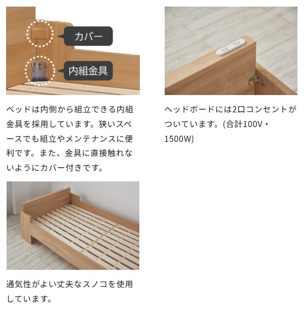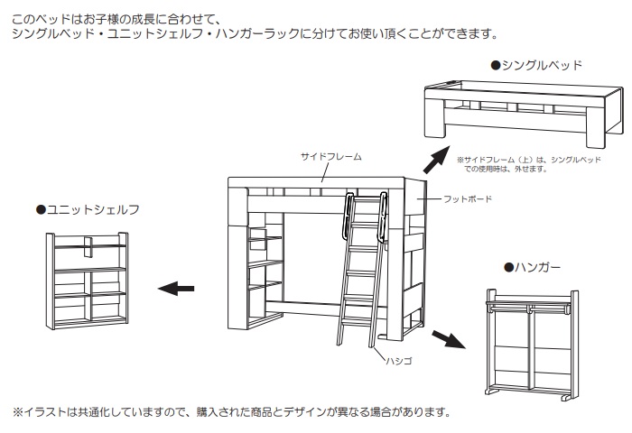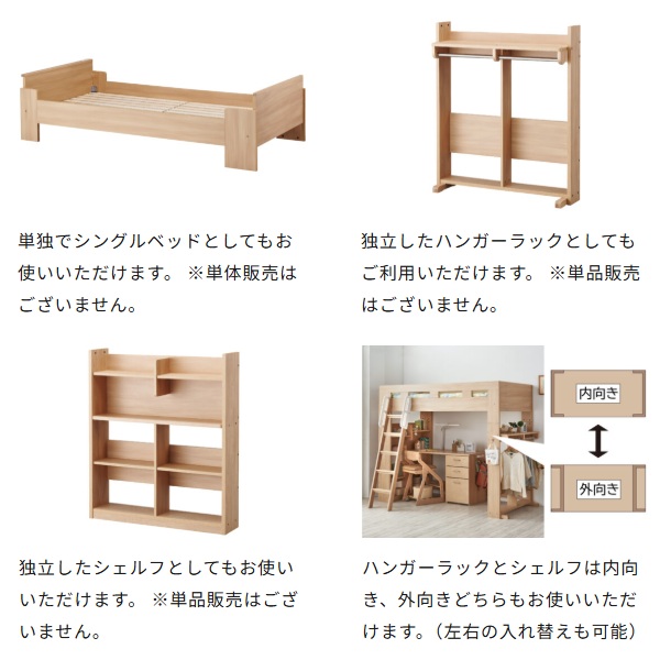 | 特徴 | 〇構成品:シングルベッド・ハンガーラック・シェルフ・ハシゴ・スノコ 〇ヘッドボードに2口コンセント付き |