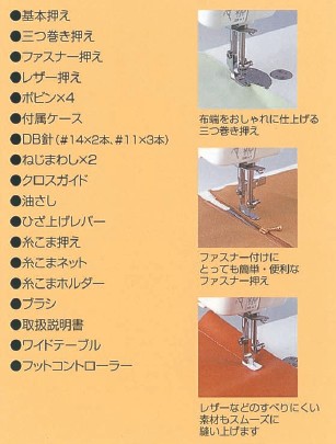 | 【主な特長】 針上げボタン ワンタッチで針が上がります。 大型フットコントローラー 長時間の作業も疲れにくい。 下糸巻き 縫っている時でも下糸が作れます。 LEDライト 6個の白色LEDライト 押え圧力 押え圧力の調節ができます。 ひざ上げレバー ひざで押えを上げられます。 大きなボビンケース取り出し口 大きくて使いやすい。 付属品一覧 ![]() | ![]() |
