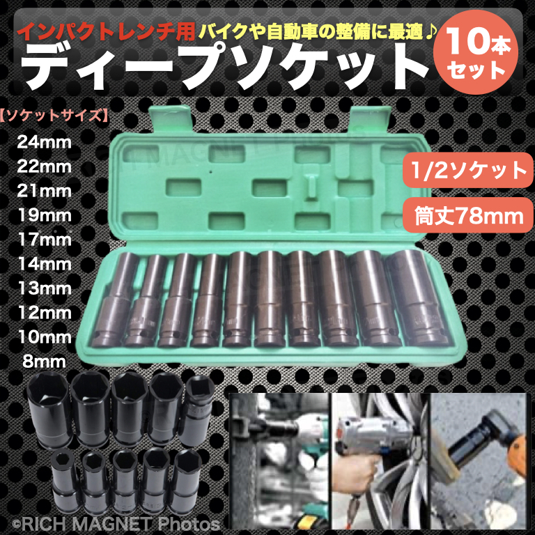 1/2 12.7mm ディープ ソケット 10本セット エアーインパクト ラチェット 24mm 22mm 21mm 19mm 17mm 14mm 13mm 12mm 10mm 8mm