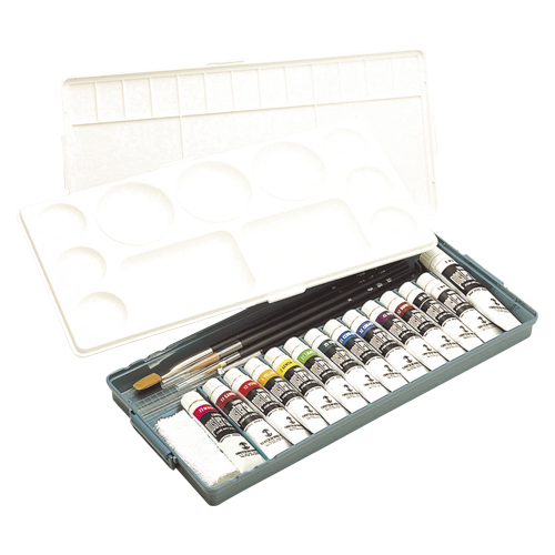 ●セット内容:11ml・13色,20ml・ホワイト1本,Wパレット付ケース,黒軸デザイン筆(ナイロン)3本(面相筆・彩色筆・平筆),黒軸棒,アクリル製ミゾ付定規(25cm),ミニふきん