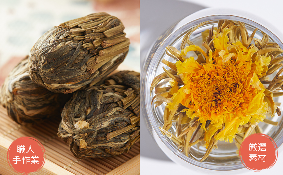 茶葉を糸でひとつひとつ手作業で束ね、その中にに乾燥させた花を包み込んで形を整えた「お湯を注ぐと花が咲く」中国茶のことです。