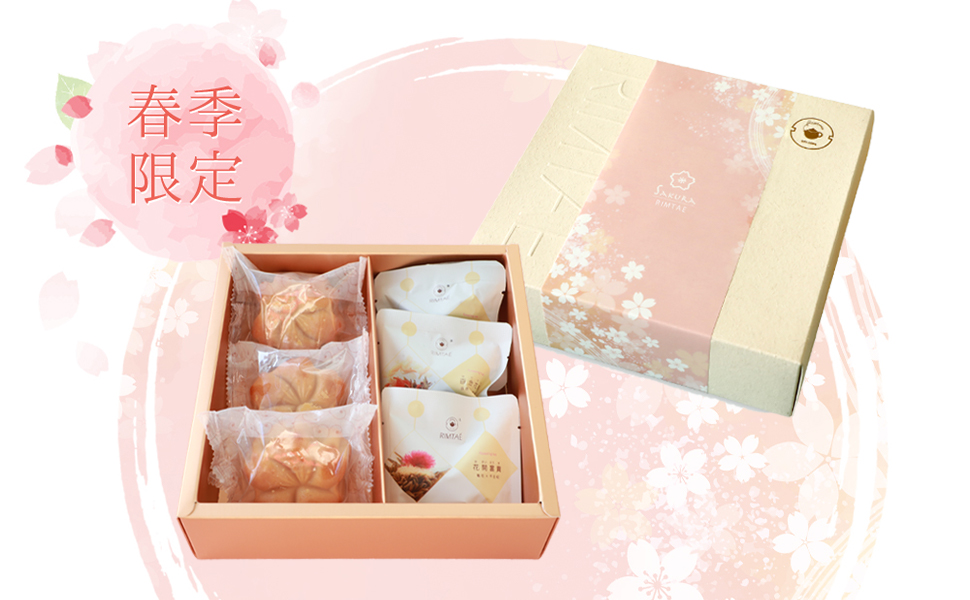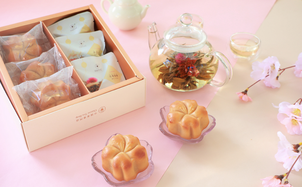 内容量:さくら月餅×3個、金花彩彩 (2.5g)×1P、花開冨貴 (2.5g)×1P、花開吉祥 (2.5g)×1P