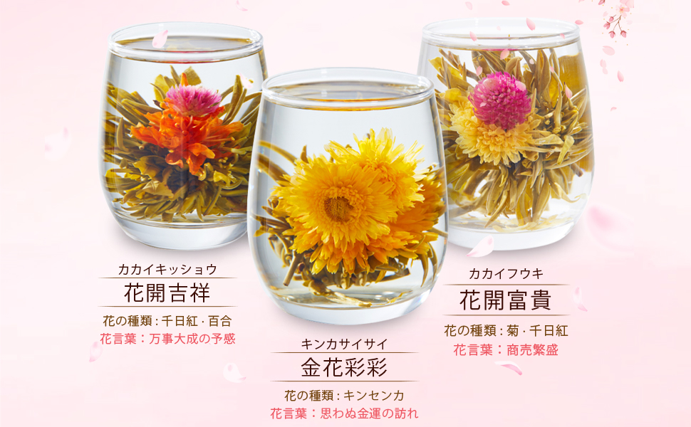 ・工芸茶「花開冨貴」x1個、工芸茶「花開吉祥」x1個、工芸茶「金花彩彩」x1