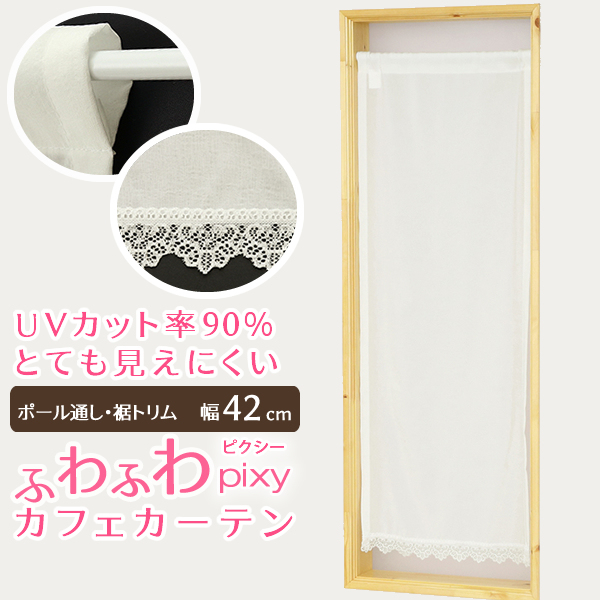 カフェカーテン レース ふわふわ 裾トリム 夜も見えにくい UVカット 「ピクシー」ホワイト 小窓 縦長窓 細長 幅42cm 送料無料 在庫品 メール便可(1枚まで)