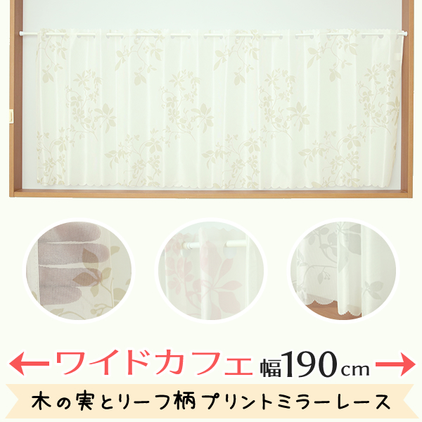 カフェカーテン レース ワイドサイズ 幅広 ミラー 昼間見えにくい 木の実とリーフ柄プリント4155 小窓 幅190cm×丈50/70/90cm 1枚入 在庫品 メール便可(1枚まで)