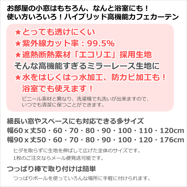 カフェカーテン レース 細幅 UVカット率99.5% 見えにくい はっ水 防カビ 4294 幅60/90×丈50/60/70/80/90/100/120cm1枚入 送料無料 在庫品 メール便可(1枚まで)