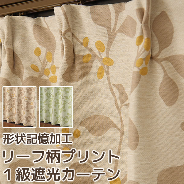 1級遮光カーテン 断熱カーテン 形状記憶カーテン リーフ柄プリントカーテン 葉っぱ柄カーテン ベージュ グリーン BE GN