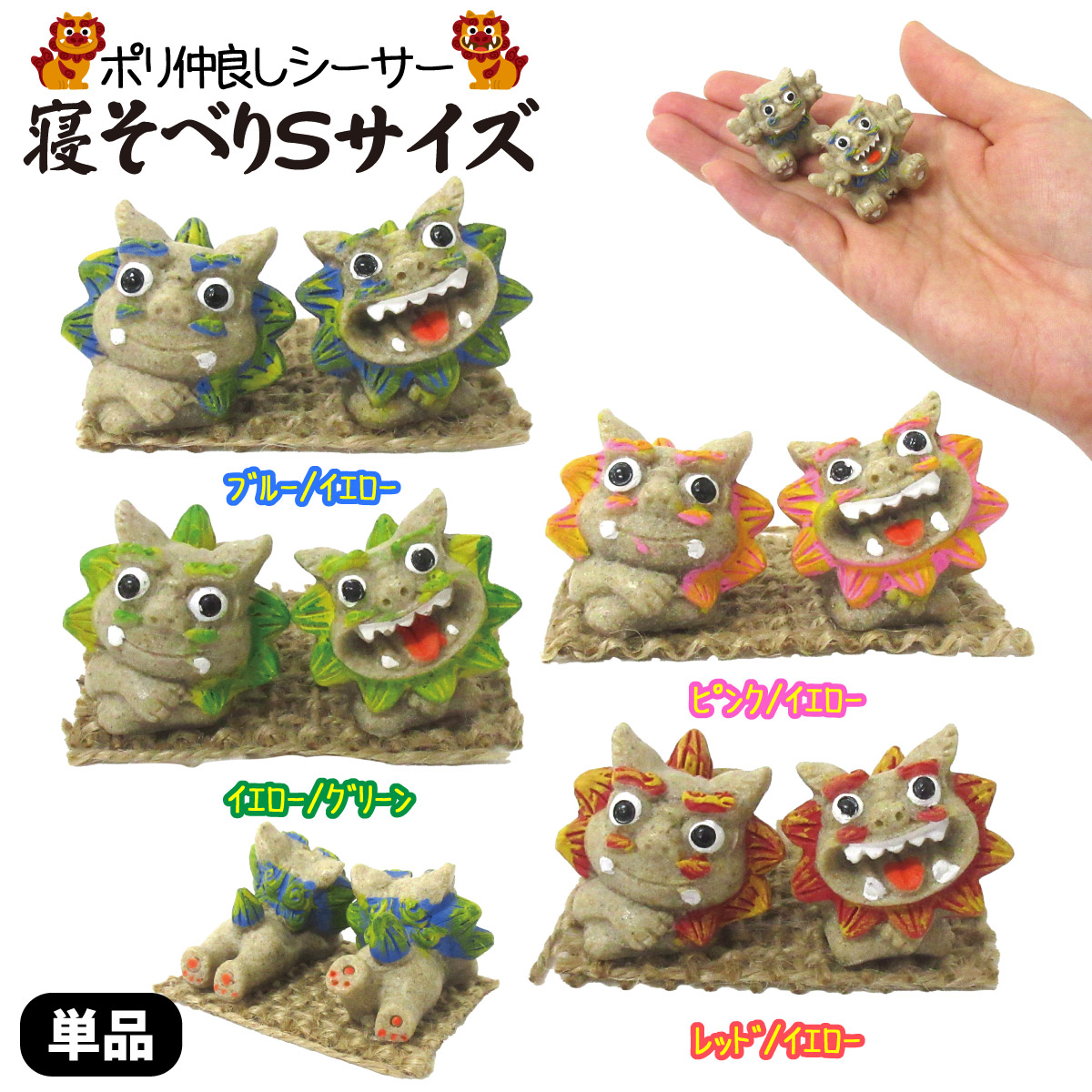 ポリ置物 仲良しシーサー 寝そべり 砂カラー Sサイズ 沖縄グッズ