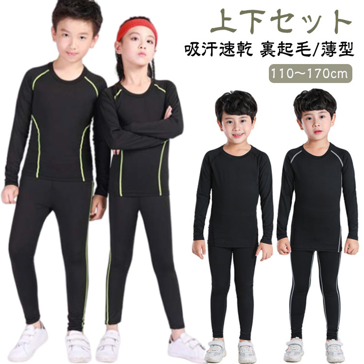 | 【上下セット】【裏起毛/薄型】【110〜170cm】【吸汗速乾】 伸縮性&速乾性&防寒性に優れたキッズ用スポーツアンダーウェア上下セット。 裏起毛と吸湿発熱素材で暖かさを維持して冷えから体を守ます。 着心地よく、動きやすい伸縮性の高い生地を採用し、締め付けないので初めてのコンプレッションウェアをきるお子様に最適です。 ドライな着心地で不快感から開放し、集中力をアップさせ、パフォーマンスを引き出します。 縫い目をフラットに縫製することで快適な肌触りを実現します。 薄手/裏起毛タイプはオールシーズンに対応し、冬場でインナーとして使えば防寒対策にもなります。 ランニング・トレーニング・野球・サイクリング・サッカー・スキー・スノーボードなど、様々なスポーツシーンでご活用いただけます。 | |