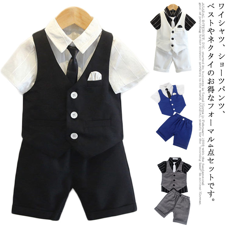 | ワイシャツ、ショーツパンツ、ベストやネクタイのお得なフォーマル4点セットです。 ハーフパンツや半袖ワイシャツのタイプで夏にぴったり! ウエストゴム入りで快適なはき心地、のびのび動けるから活動的な男の子にもピッタリ。 卒業式・入学式・結婚式・発表会・お受験まで、幅広く着用することが出来ます。 | |
