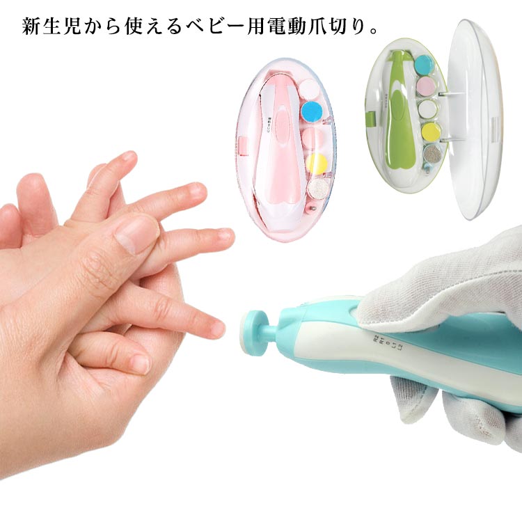 | 新生児から使えるベビー用電動爪切り。 強く当たると止まってくれるので指を切る心配や、爪の切りすぎる心配がなく、安心です。 コンパクトなのでお出掛け先や、旅行先などへの持ち運びも大変便利です。 6種のアタッチメントを付属しており、新生児から大人まで老若男女ご使用いただけます。 スピードは、選べる2段階。 35dBの非常に静かな静音設計なので、赤ちゃんが寝ている間でも爪のケアができます。 人間工学に基づいた、握りやすいデザイン設計。 6つのアタッチメントと本体がまとめて収納できる専用ケース付き。 便利なLEDライト付き。 イエロー:0〜3ヶ月 ピンク:4〜11ヶ月 ブルー:12ヶ月以上 その他:大人用 | |