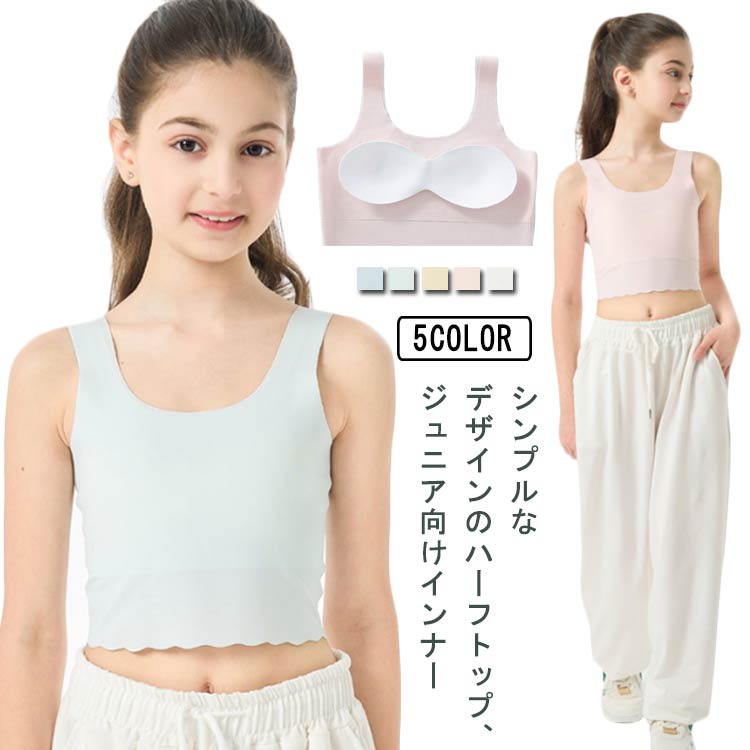 | シンプルなデザインのハーフトップ、ジュニア向けインナー 肩に負担がかかりにくい ストラップは安定感のある幅広タイプ。 成長中のバストをやさしく支えるノンワイヤータイプ。 ブラジャーに抵抗のある着け始めのお子さまに。 生地は吸汗速乾性素材を使用しているので、さらっとした肌あたりです。 | |