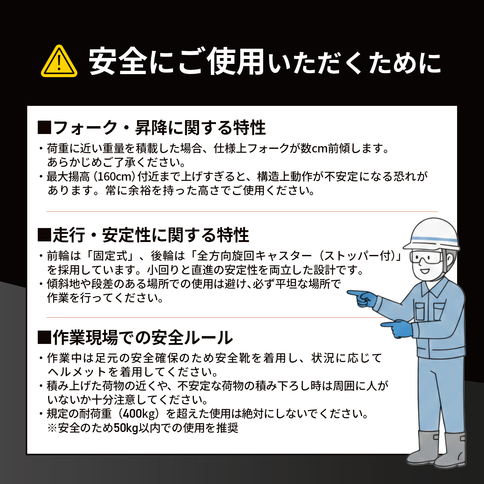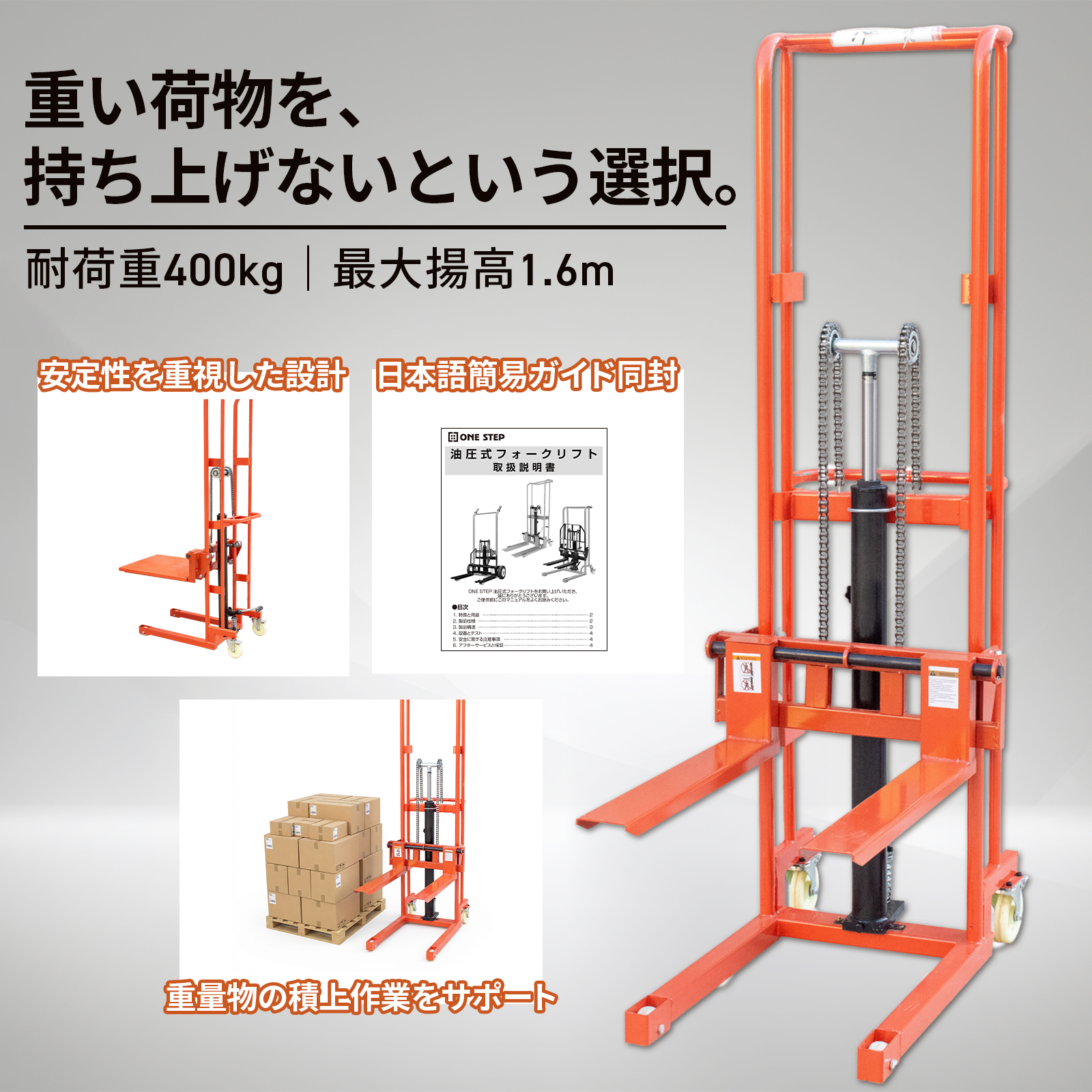 重い荷物を持ち上げないという選択耐荷重:400kg・最大揚高:1.6m