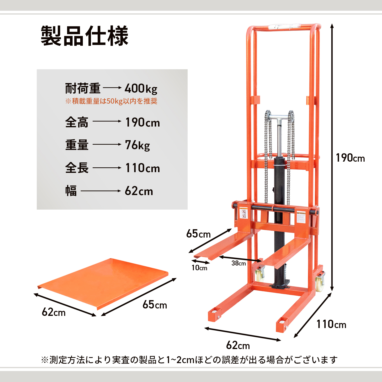 ハンドフォークリフト 昇降 最大揚高160cm 耐荷重400kg