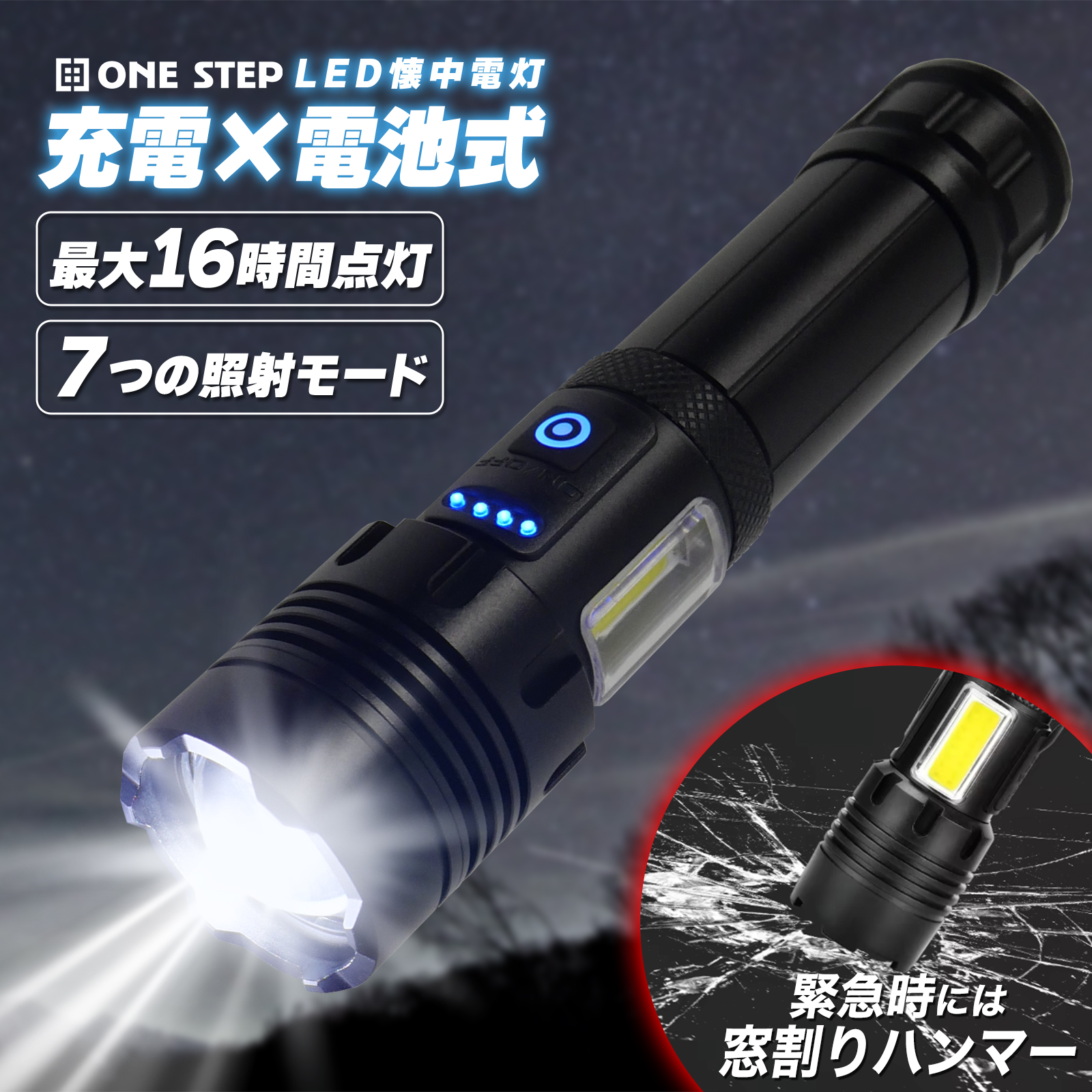ONE STEPのLED懐中電灯が選ばれる6つの理由7つの照射モード、IPX6の防水性能、Type-C USB充電、照射範囲変更、最大16時間電灯、モバイルバッテリー