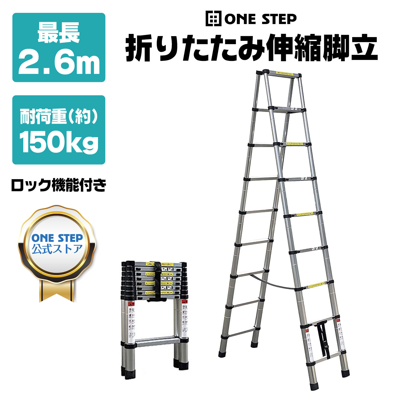 脚立 アルミ 9段 2.6m 伸縮 折りたたみ 踏み台 伸縮脚立 梯子 はしご スライド式 安全ロック 耐荷重150kg