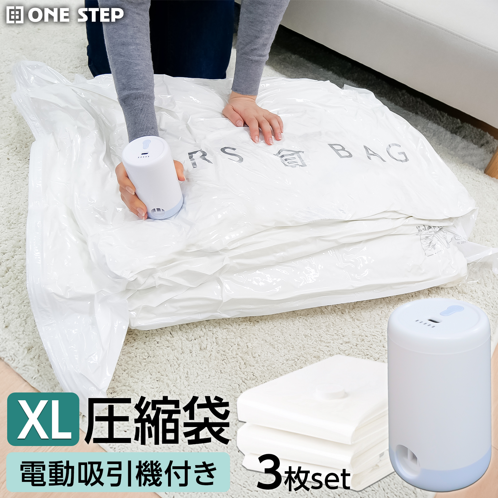 圧縮袋 XLサイズ3枚 電動吸引機 セット バルブ式 真空圧縮収納 衣類 毛布 ダブルジッパー