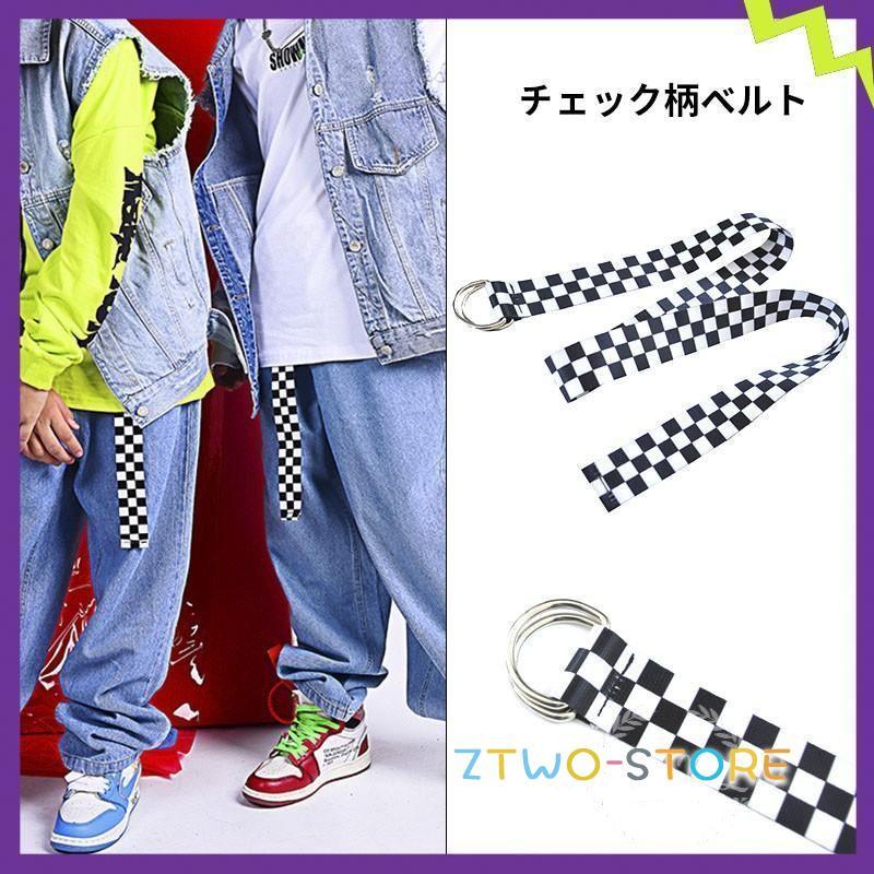 ブラックホワイトチェック柄ベルト ダンス衣装 キッズ ヒップホップ リングベルト ロゴテープ ダンスファッション