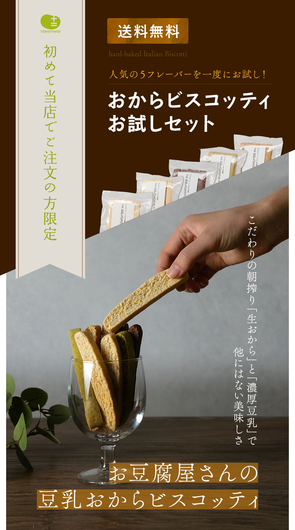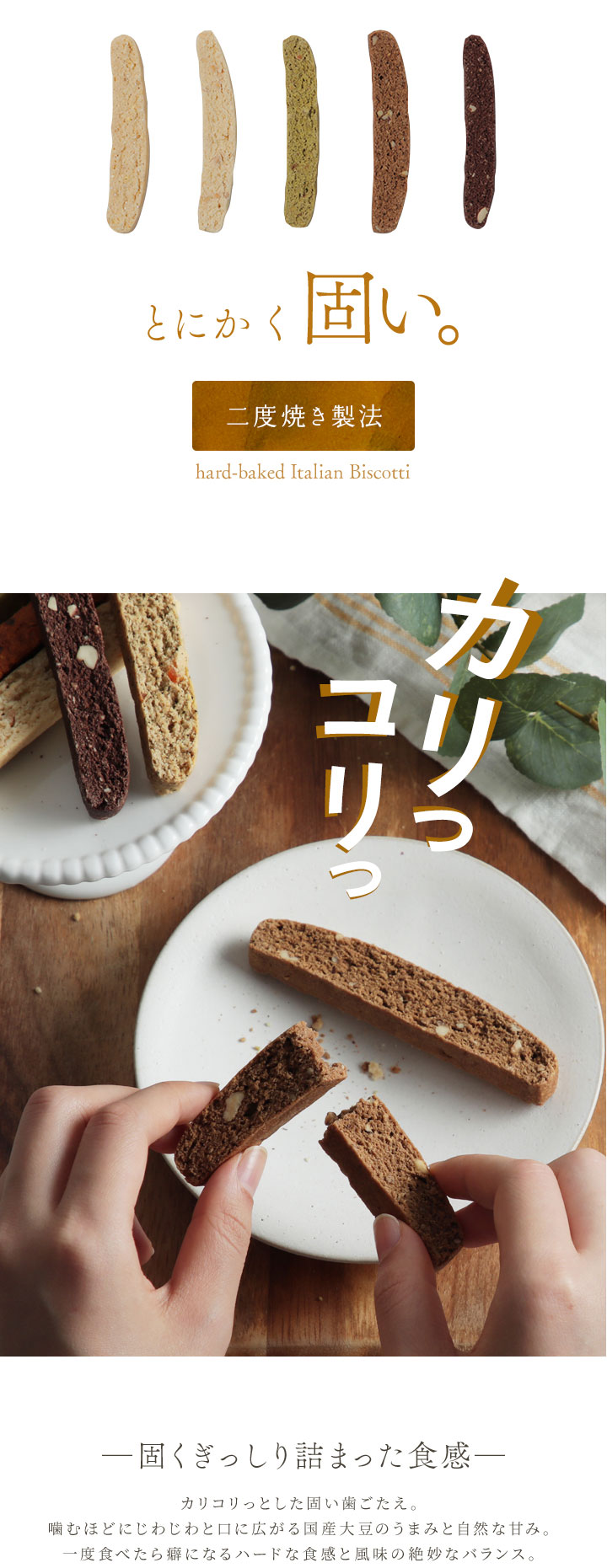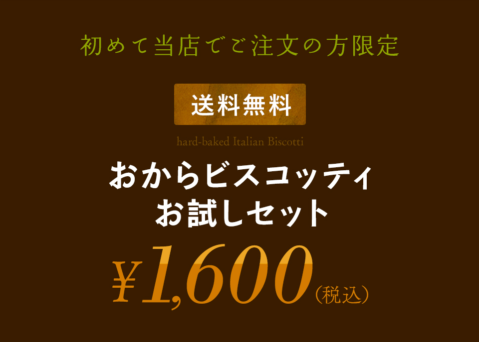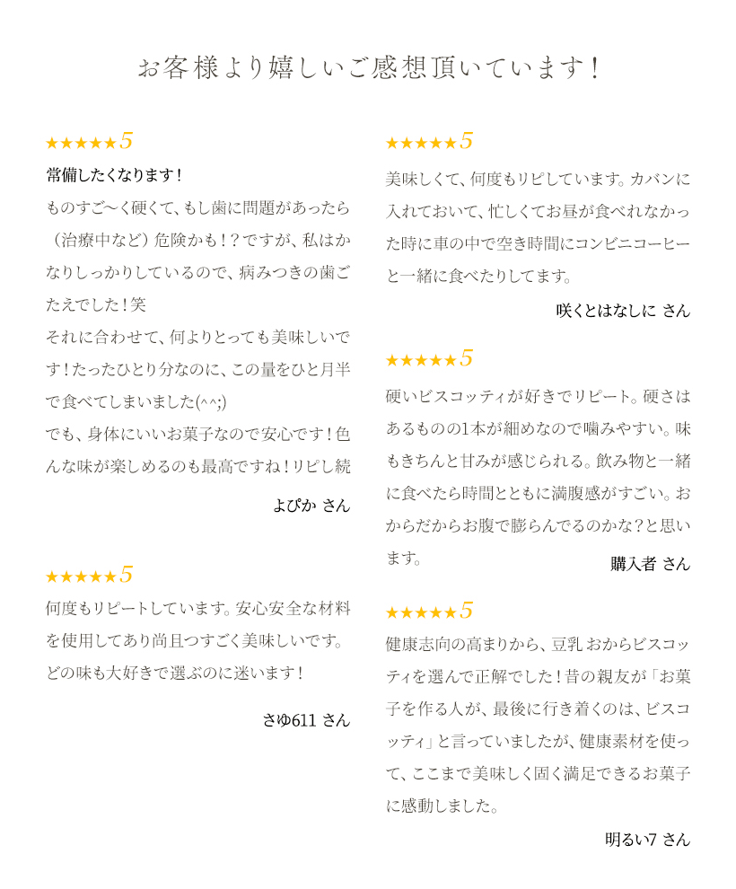 | ※おからビスコッティの各フレーバーの平均値となります。 ※政府機関が公表している食品成分データベースに基づく原材料の栄養成分量から算出した値となり、各フレーバーごとに上下の誤差ございます。 | |