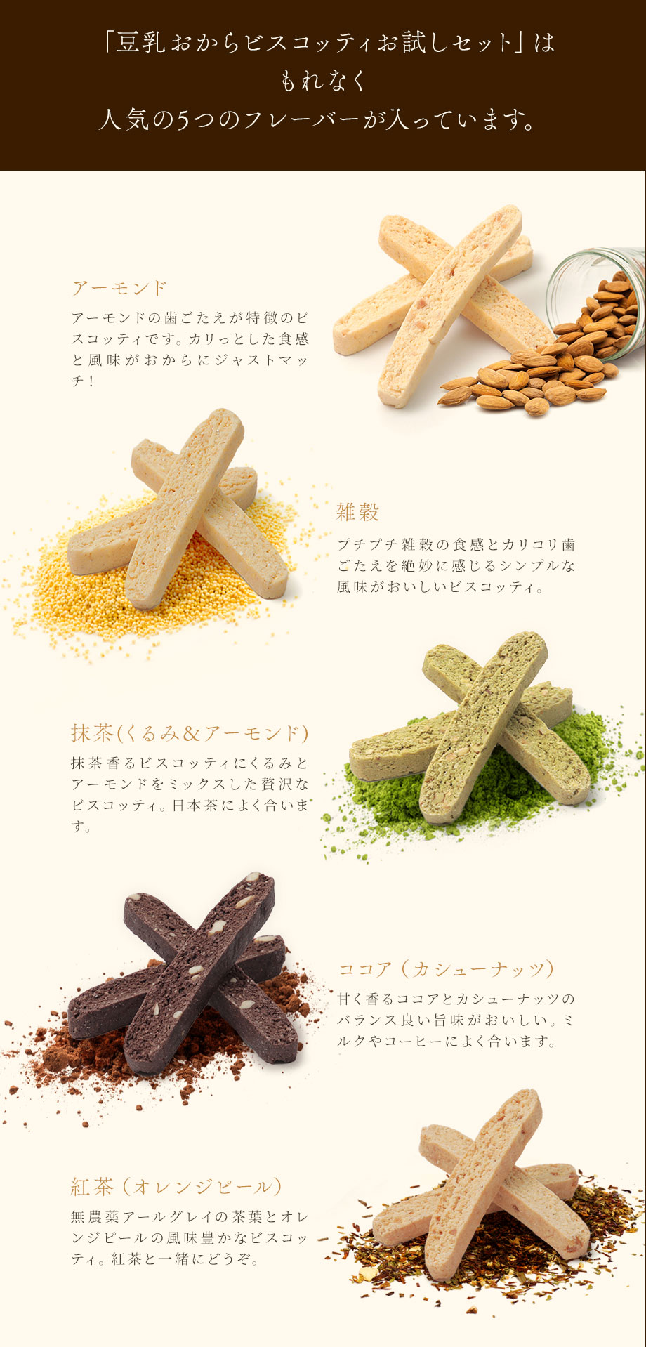 [プレーン(アーモンド)] [プレーン(雑穀)] [抹茶] [紅茶] [ココア] |