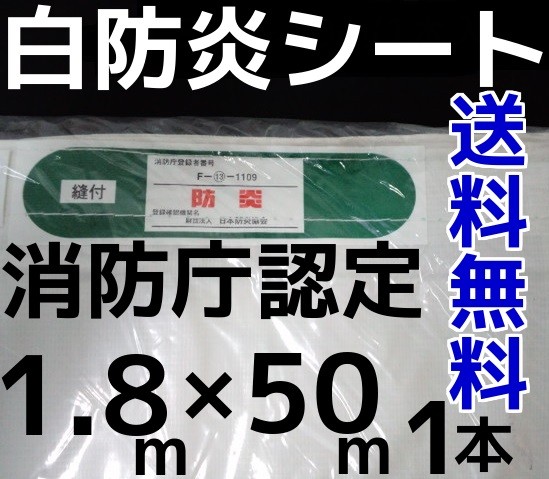 消防庁認定 輸入白防炎シート 1.8m×50m 1本 原反 ハトメなし 送料無料(本州/四国/九州)「同梱/キャンセル/変更/返品不可」