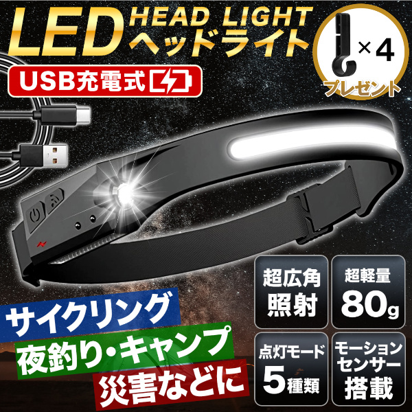 ヘッドライト 充電式 LED COB 超広角 ヘッドランプ キャンプ 明るい 軽量 モーションセンサー タッチレス ハンズフリー 超強力 作業灯 釣り アウトドア