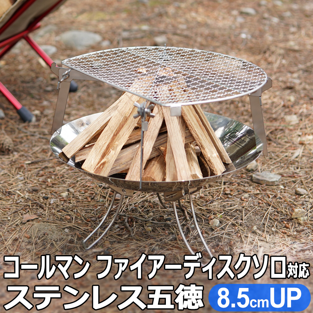 φ300mmの丸型焚き火台対応の足幅調整機能付き五徳となります。五徳を使用する事でコールマン ファイアーディスクソロ本体の焼き網が約85mm嵩上げでき、薪を使った焚き火料理やキャンプ飯を楽しめます。