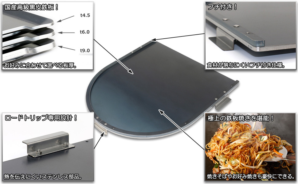 初めての方でも扱いやすい黒皮鉄板を使用し、通常の鉄よりも錆びにくい表面となります。使うほど鉄板に油が馴染んでいきますので繰り返しお使い頂くことで焼き上がりが良くなっていきます。板の厚みは4.5mm、6mm、9mmをラインナップし、予算や用途に合わせてお選び頂けます。