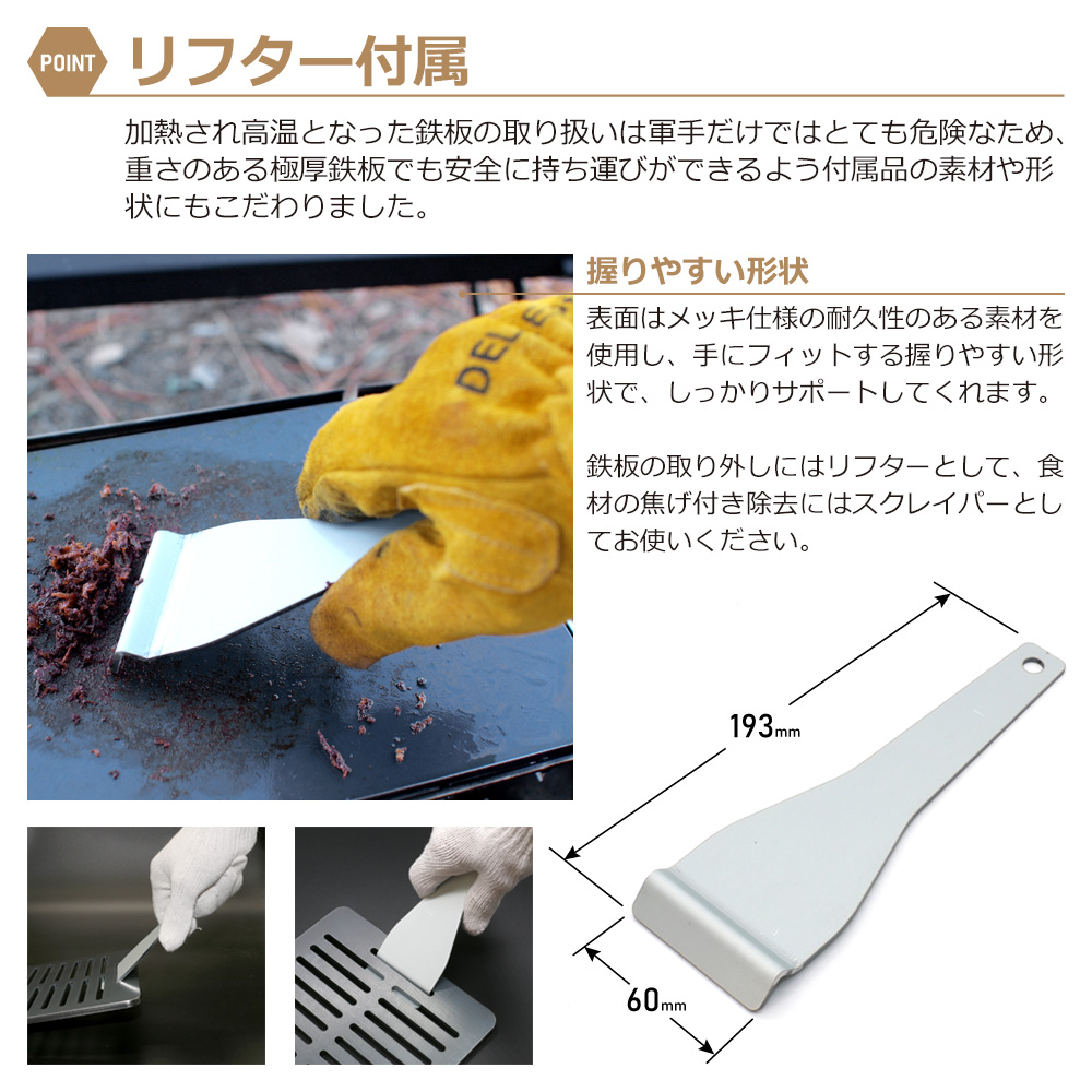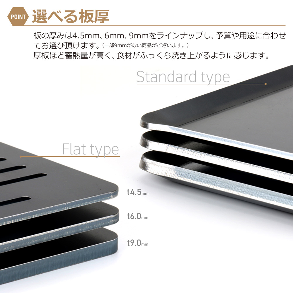 バーベキュー鉄板は厚板であるほど、蓄熱量が高くなります。薄板鉄板は蓄熱量が少なく表面のみが高温となるため、食材に十分な熱を伝えることができません。そのため表面は黒焦げ、中は生焼けなんて経験はございませんか?