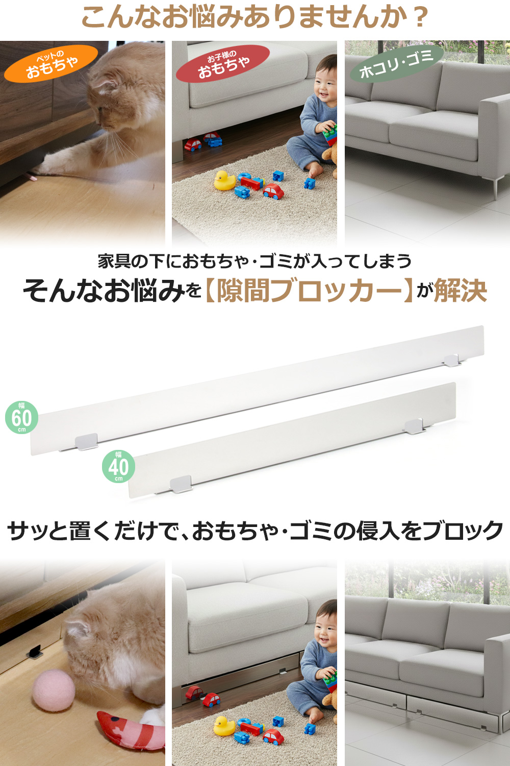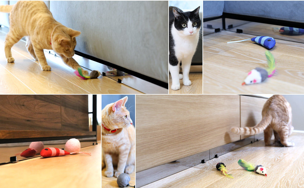設置することで、ソファーやベッド下などにペットのボールやおもちゃねずみが入り込むのを防ぎます。