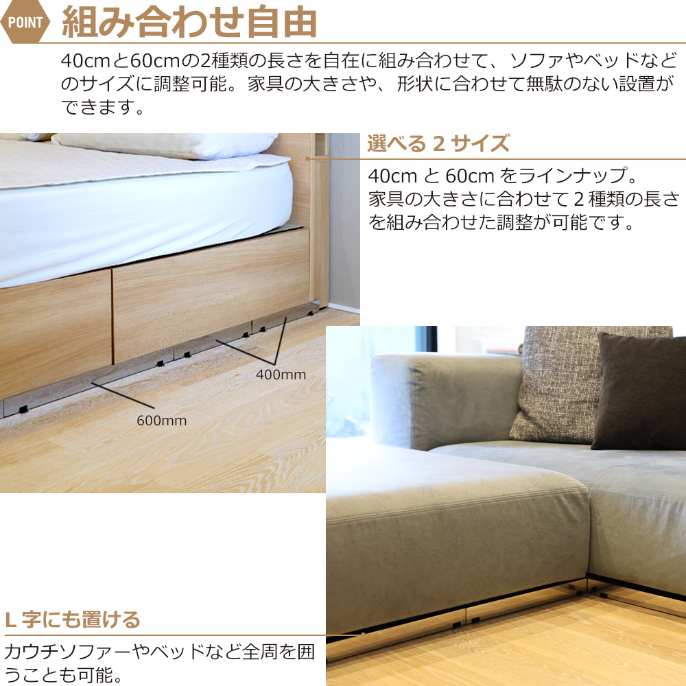 ソファーやベッドサイズに合わせて調整できるよう、長さ40cmと60cmの2種類をラインナップ。