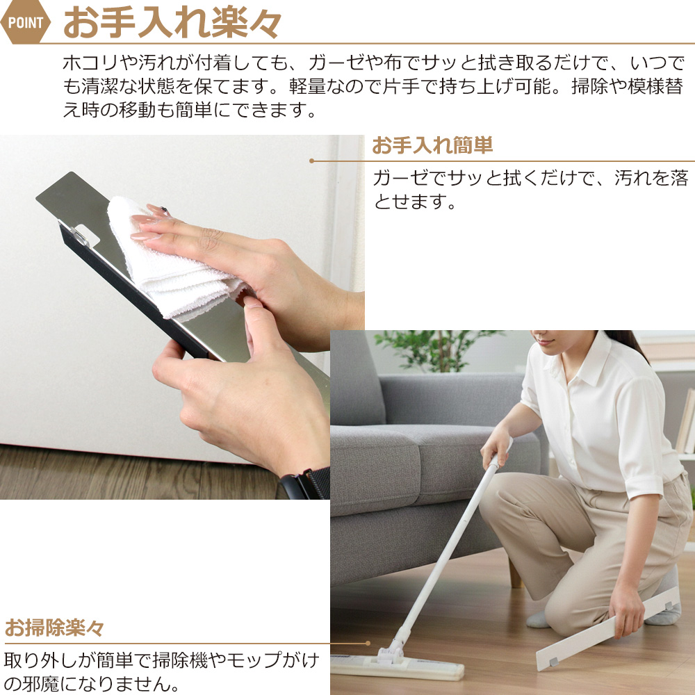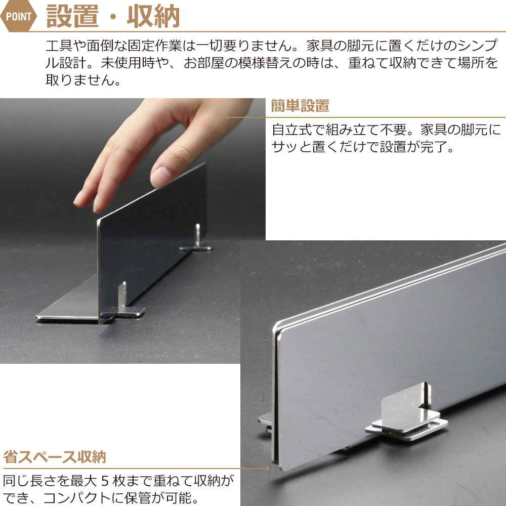 ステンレス製で耐久性が高く、家具の大きさ合わせて設置できるので、リビングや寝室など様々な場所で活用できます。