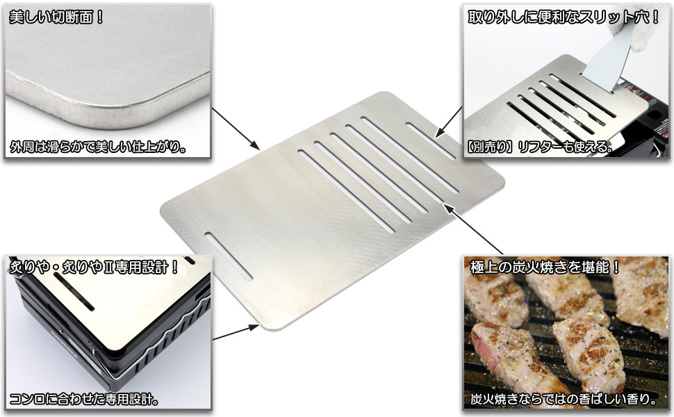 炙りや2・炙りや・炙家W・炙家付属の網を取り外し、本商品をのせ替えるだけでご使用頂けます。コンロに合わせたプレートサイズなので使い勝手抜群です。