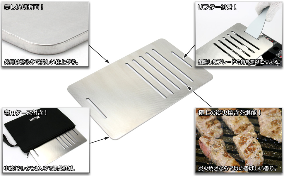 バーベキュー鉄板は厚板であるほど、蓄熱量が高くなります。薄板鉄板は蓄熱量が少なく表面のみが高温となるため、食材に十分な熱を伝えることができません。そのため表面は黒焦げ、中は生焼けなんて経験はございませんか?