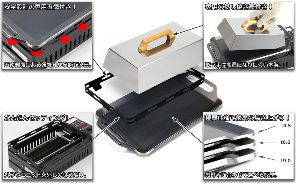 グリルプレート+五徳、グリルプレート+五徳+蒸し焼き蓋、グリルプレート+五徳+蒸し焼き蓋+サイドトレーからお客様に合わせてお選びいただけます。