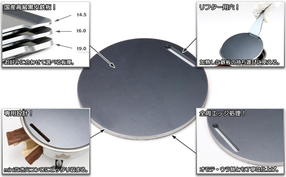 初めての方でも扱いやすい黒皮鉄板を使用し、通常の鉄よりも錆びにくい表面となります。使うほど鉄板に油が馴染んでいきますので繰り返しお使い頂くことで焼き上がりが良くなっていきます。板の厚みは4.5mm、6mm、9mmをラインナップし、予算や用途に合わせてお選び頂けます。