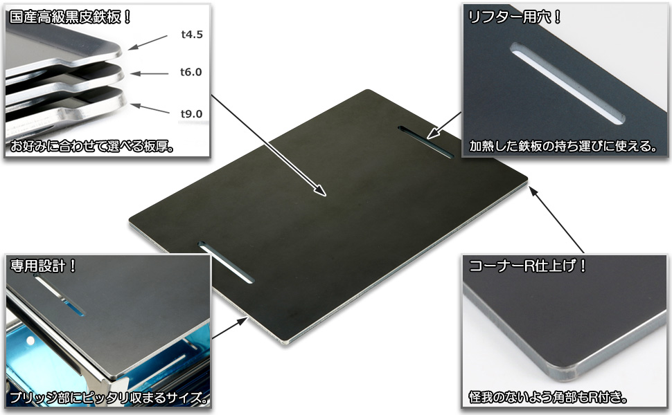 初めての方でも扱いやすい黒皮鉄板を使用し、通常の鉄よりも錆びにくい表面となります。使うほど鉄板に油が馴染んでいきますので繰り返しお使い頂くことで焼き上がりが良くなっていきます。板の厚みは4.5mm、6mm、9mmをラインナップし、予算や用途に合わせてお選び頂けます。