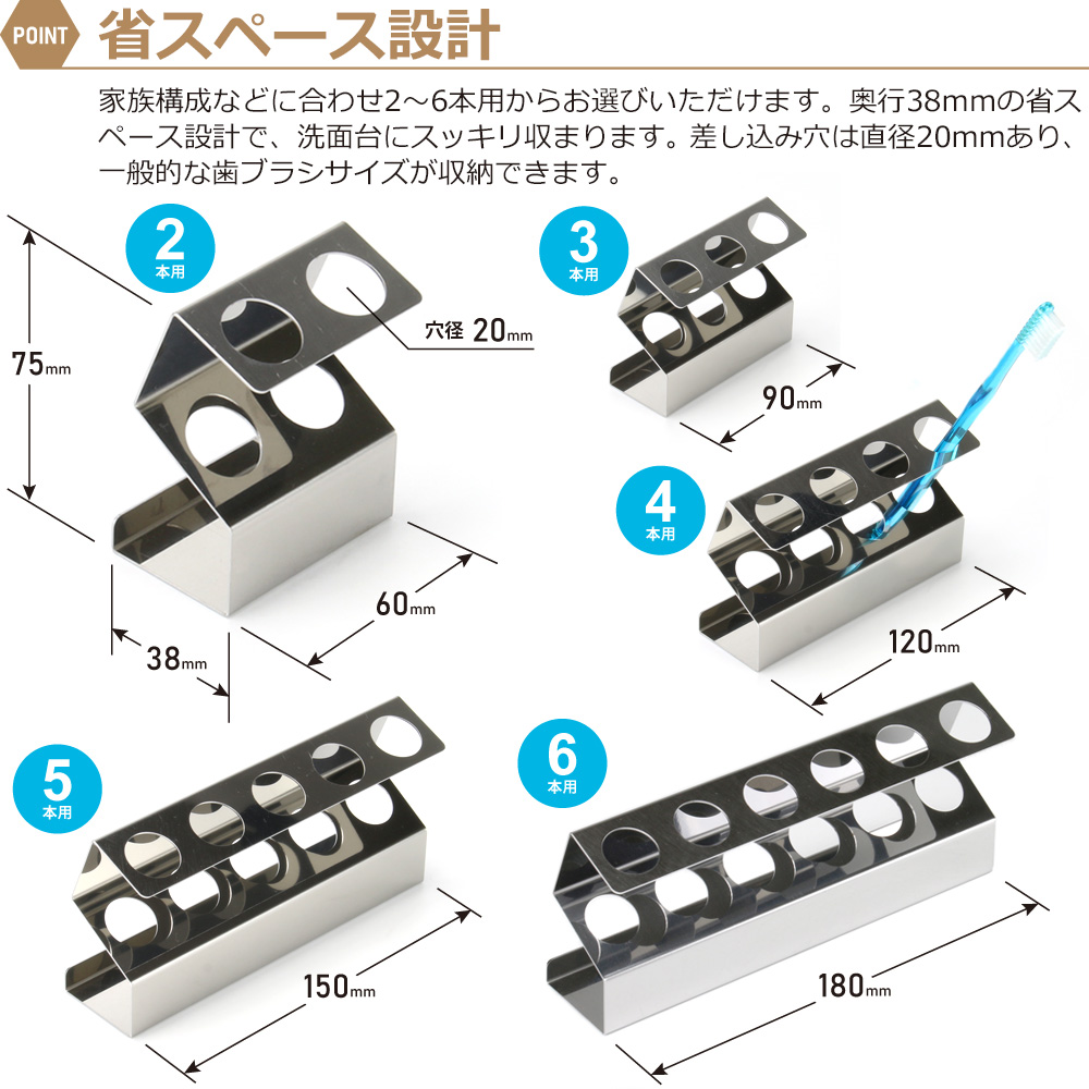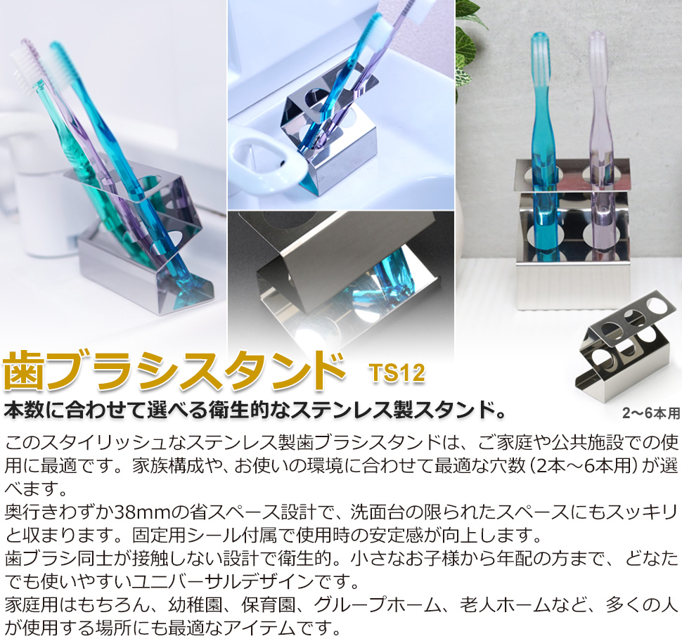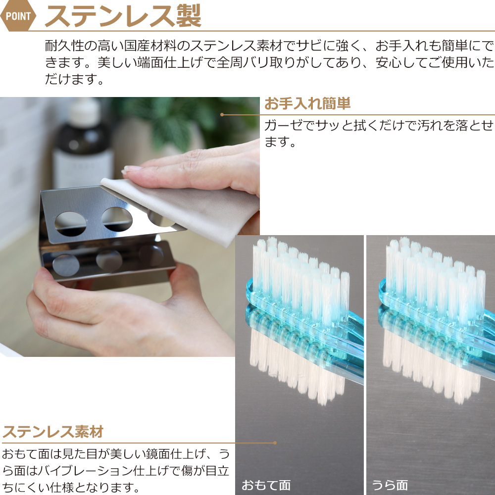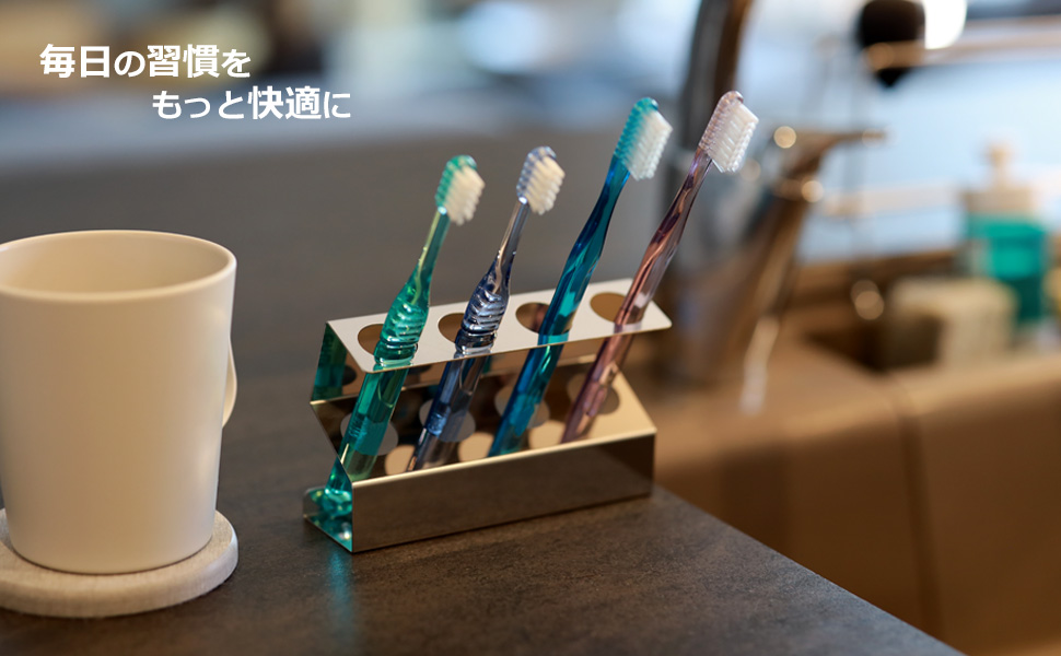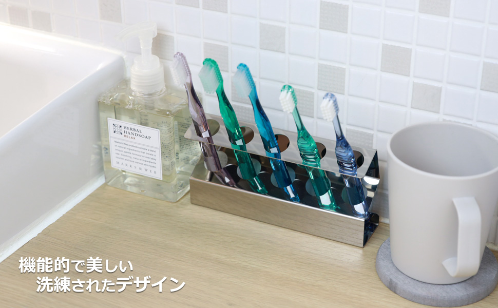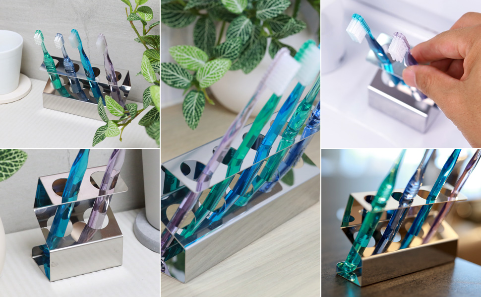 このスタイリッシュな歯ブラシホルダーは、ステンレス製で、歯ブラシの本数に合わせて収納できるため、家族や共有スペースでの使用に便利です。