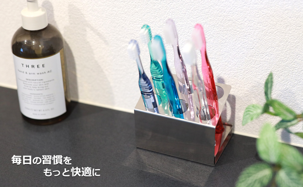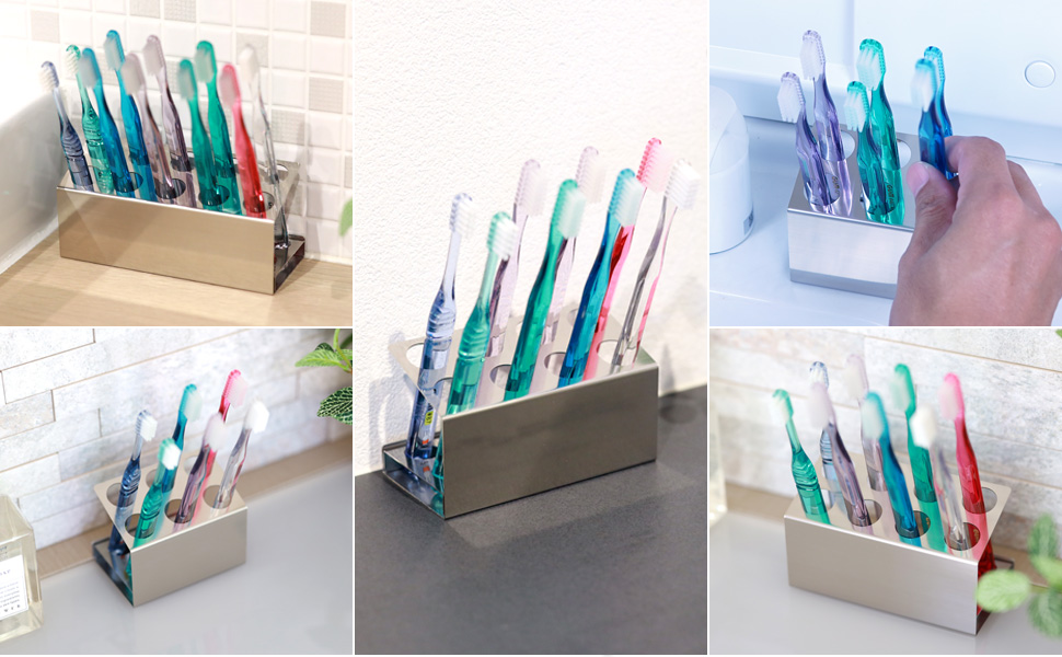 このスタイリッシュな歯ブラシホルダーは、ステンレス製で、歯ブラシの本数に合わせて収納できるため、家族や共有スペースでの使用に便利です。