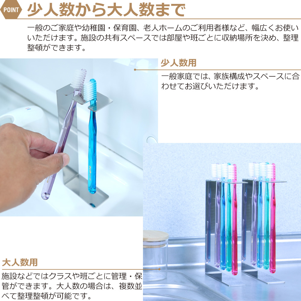 ステンレス製で錆びに強く、歯ブラシを浮かせて収納できるため、衛生的で清潔な環境を保ちます。