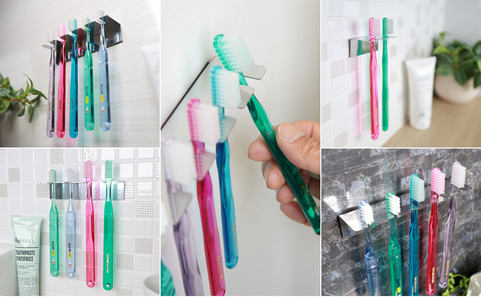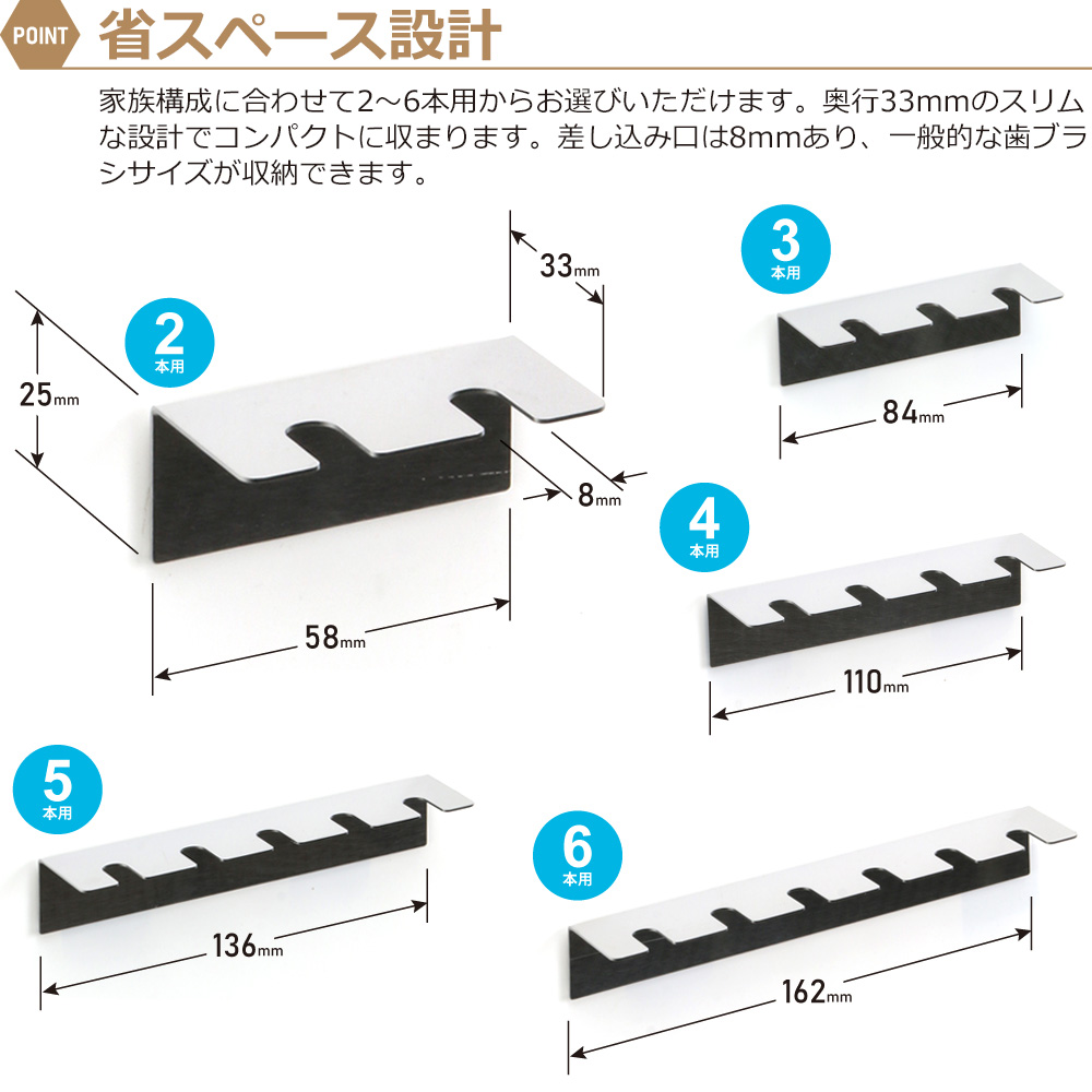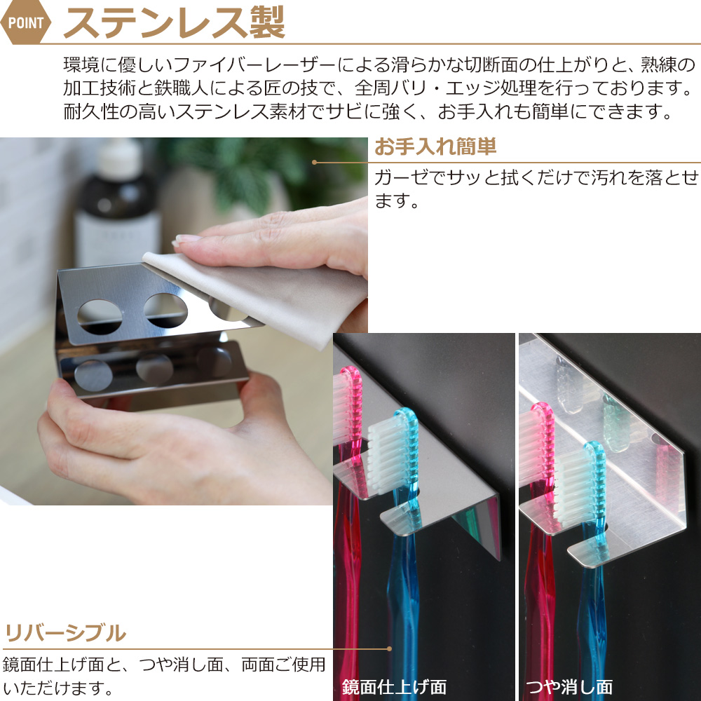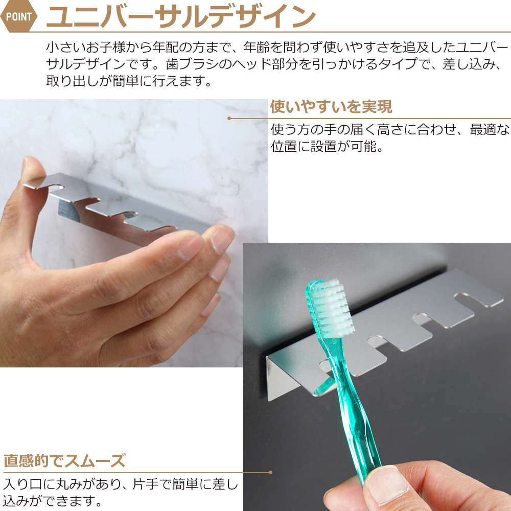 ステンレス製で錆びに強く、長期間使用しても美しさを保ちます。壁掛け式で、歯ブラシを浮かせて収納することで、通気性を確保し、衛生的な環境を維持します。カビが発生しにくい素材で、清潔さを保ちながら、6本の歯ブラシを収納可能です。
