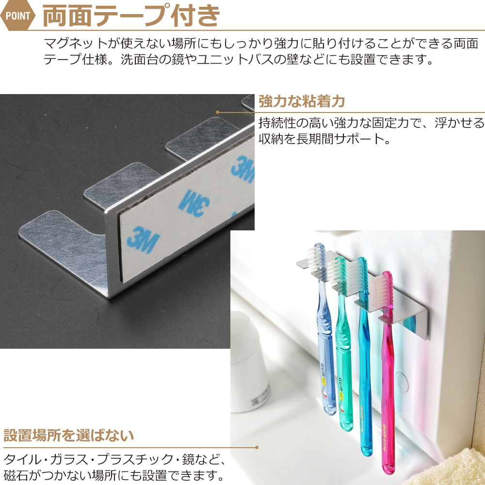 マグネットが付かないタイル・ガラス・プラスチック・鏡などにも強力両面テープで簡単に貼り付けることができ、洗面台のスペースを有効活用できます。