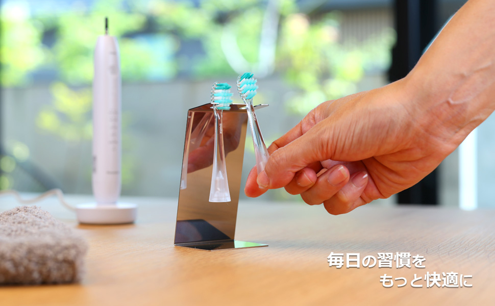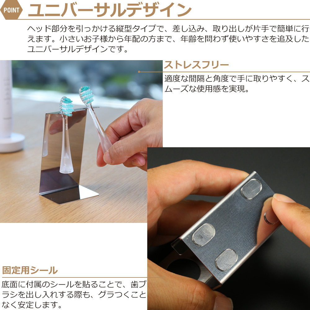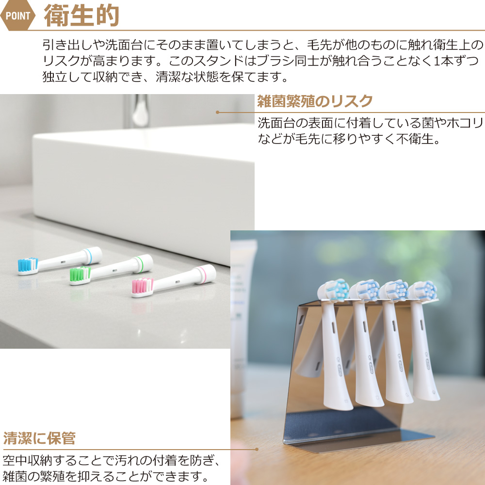 ステンレス製で錆びに強く、洗面所での使用に最適です。浮かせる設計により、ブラシが空気に触れやすく、衛生的で防カビ効果も期待できます。